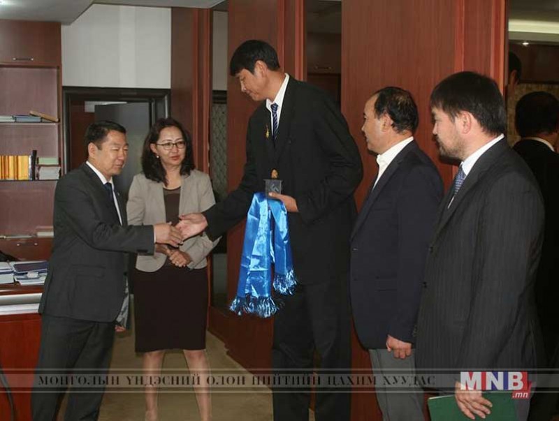 Тамга хүлээлцэх үед БСШУС-ын сайд Ж.Батсуурь, Биеийн тамир, спортын хөгжлийн төвийн захирал асан Д.Жаргалсайхан, Биеийн тамир, спортын бодлогын хэрэгжилтийг зохицуулах газрын дарга асан Х.Бахытжан нарын зэрэг албаныхан оролцов.